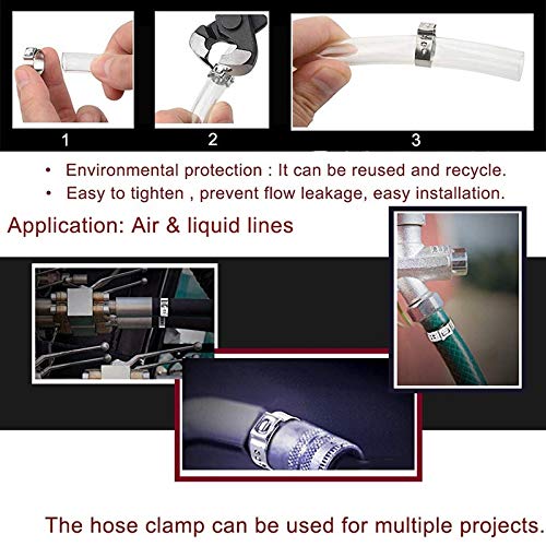 Hose ClampsMaterial: 304 Stainless SteelStepless 1 ear clamp/single earl4.7-6.5mm5.8-7.0mm7.0-8.7mm7.3-9.0mm7.8-9.5mm8.8-10.5mm9.5-11.3mm9.4-11.9mm10.3-12.8mm10.8-13.3mm11.5-14.0mm12.3-14.8mm12.8-15.3mm13.5-16.2mm14.1-16.6mm15-17.5mm14.8-18mm15.3-18.5mm16-19.2mm16.6-19.8mm17.8-21mm19.4-22.6mm20.3-23.5mm100pcs ClampsModel Number : Single Ear Stepless Hose ClampsStructure : Spring ClampDIY Supplies : PlumbingMaterial : Stainless steelUse : Pipe ClampTotal Quantity : 100pcs