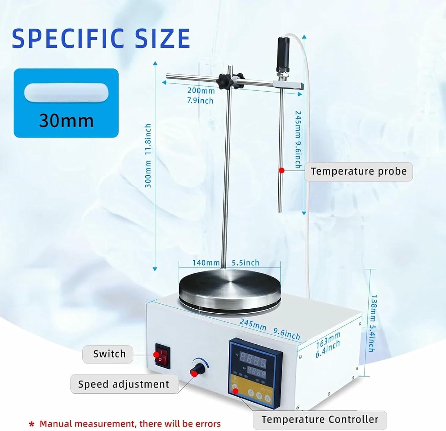 Spec: Item Type: Magnetic Stirrer Heating Power: 300W Stepless Speed Regulation: 0-2500RPM Display: Digital Display Temperature control range: RT+5°C-100°C Maximum mixing volume: 1500ml Heating plate diameter: 140mmHow to Use: When using the stirrer, first check whether the accessories are complete, and then install the fixture in order first, and put the solution required to stir in the center of the chrome plate. Add the solution and put the mixer in the beaker solution, then plug in the power plug of the instrument, and then switch on the power supply to open the power speed switch, the indicator light is on, that is, start to work, and then select the temperature you need, the speed is gradually adjusted from low speed to high speed, do not allow the high speed to start directlyPackageList: 1 x Stirrer