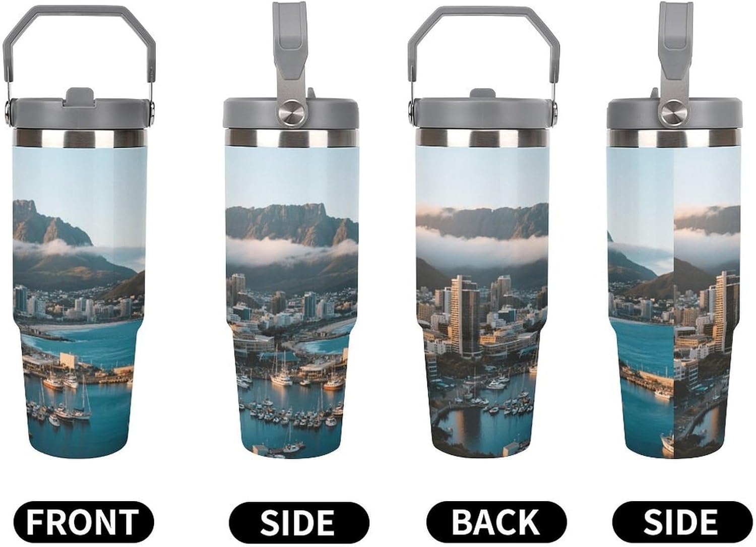 Whether you're on a long drive, a busy commute, or an outdoor adventure, staying hydrated is crucial. Our large-capacity car tumblers featuring the Cape Town City View pattern were developed with this need in mind. They're the perfect solution for on-the-go hydration, ensuring a smooth and comfortable journey. With an impressive 30-ounce capacity, this insulated stainless steel travel tumbler easily meets your frequent hydration needs, from your morning commute to your after-get off work workout or even a full-day road trip. Without constantly searching for water, you can focus on the road ahead and say goodbye to thirst. Whether you're sweating it out on a scorching summer day or sweltering in your car on a dry winter night, staying hydrated helps you perform at your best. We understand your appreciation for quality and aesthetics, and our car tumblers feature unique designs that complement any vehicle's interior, exuding understated elegance. More than just a practical tool, they're the perfect finishing touch, adding a touch of style to your vehicle's interior.