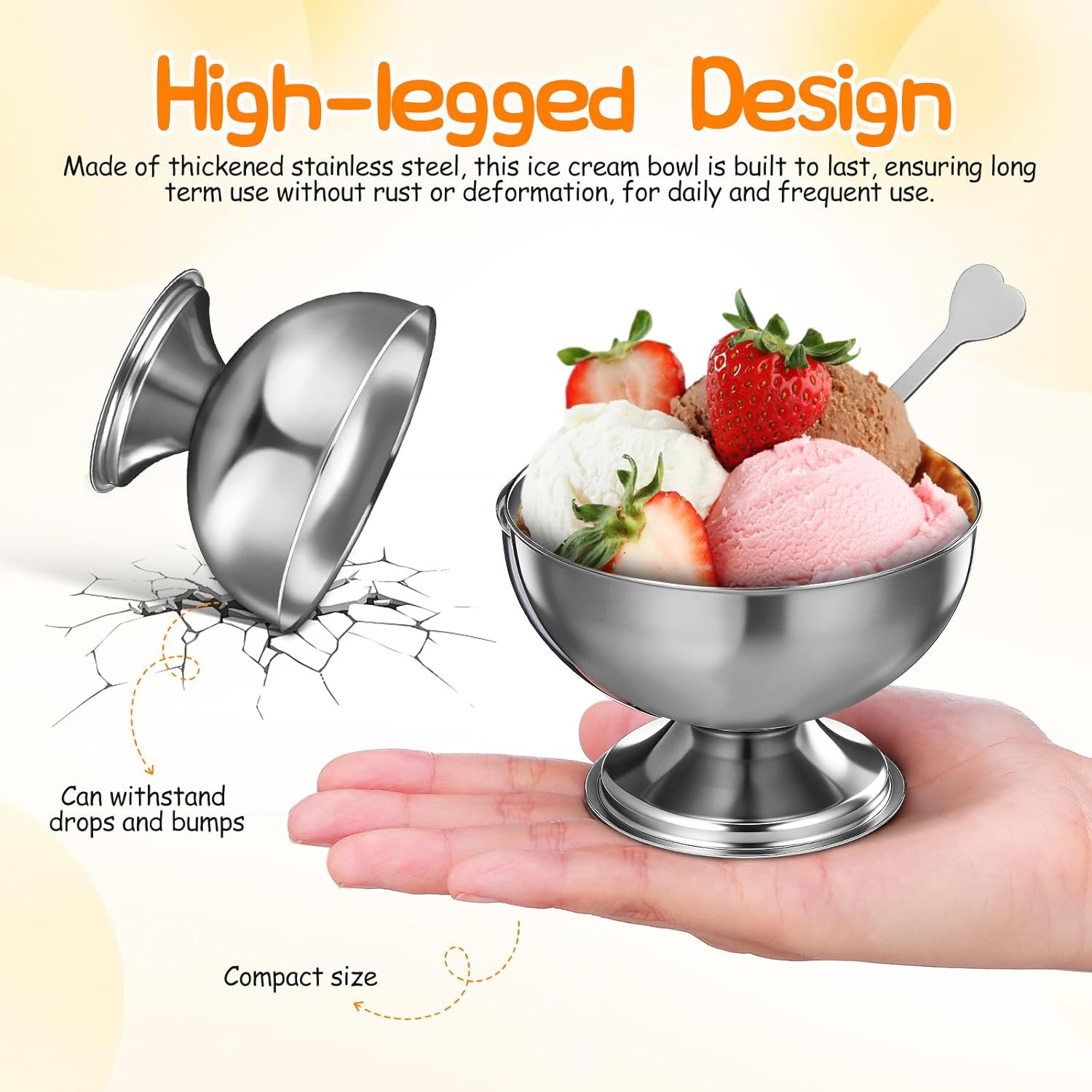 DescriptionThese stainless steel ice cream bowls offer a practical and stylish way to serve your favorite desserts Designed with a footed base, each bowl stands steadily while adding an elegant touch to your table setting Their compact size of 3.58X3.58X2.36 inches allows easy serving of ice cream, puddings, salads, or fruit, making them versatile for everyday use or special occasionsIdeal for family meals, holiday celebrations, or casual parties, these stainless steel dessert cups enhance the presentation of sundaes, parfaits, and snacks Their sleek silver color and minimalist design complement any kitchen or dining decor, bringing a modern feel to your dessert experienceFeatures- Color: Silver- Material: Stainless steel- Size:9.10X9.10X6.00cm/3.58X3.58X2.36in- stainless steel construction provides sturdy to stains and odors, ensuring a hygienic serving option- Footed dessert bowls designed for stability while serving ice cream, pudding, salads, or appetizers- Stackable and Compact design saves kitchen space by easily nesting inside one another- Multipurpose use as ice cream bowls, parfait cups, salad bowls, or decorative dessert cups- Suitable for home dessert shops, kitchens, restaurants and social gatheringsUse these reusable stainless steel ice cream bowls to elevate your dessert presentation during family parties, restaurant service, or casual get-togethers Their easy-to-clean surface and sturdy build make them a practical choice for serving cold and warm dishes alikePackage Including4x bowl 4x fork