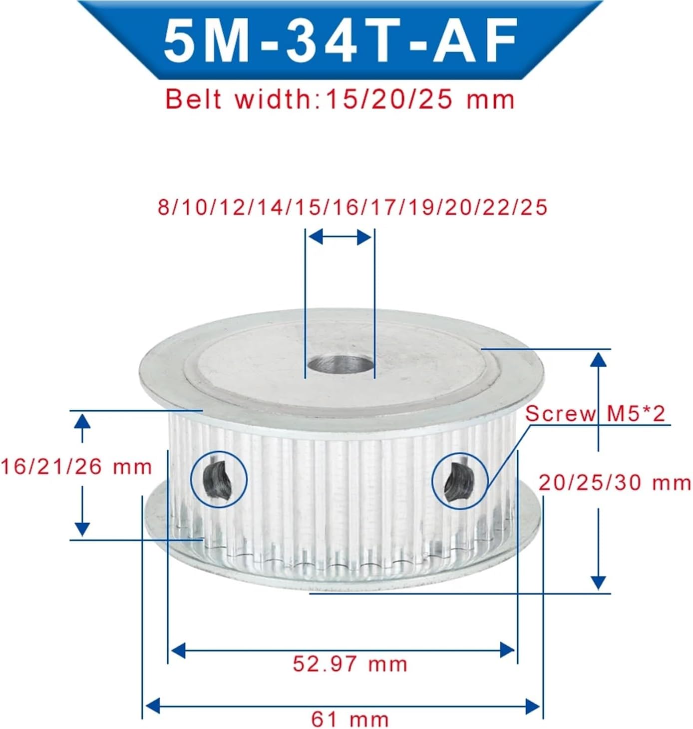 Rack & Pinion GearsProduct DescriptionPulley Model:Timing Pulley-HTD5MTeeth Number:34 TeethPulley Material:AlloyPulley Teeth Shape: Circle-arc ToothTeeth Pitch:5.0 mmBelt Width:15/20/25 mmBelt Model:HTD5M&S5M Number of Teeth : 34Model Number : Timing Pulley 5M34TMaterial : Alloy Teeth pitch: : 5 mmPulley shape: : AF shapeInner bore: : 8/10/12/14/15/16/17/19/20 mmSlot width: : 16/21/26 mmBelt width: : 15/20/25 mm