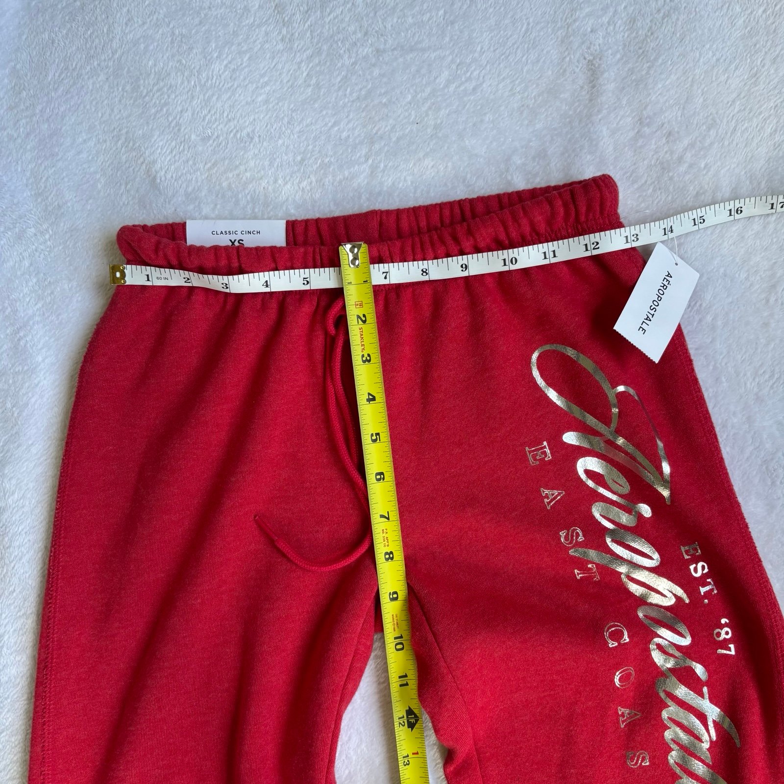 The Aeropostale Juniors Fleece Cinched Jogger Sweatpants in size XS are a stylish and comfortable activewear option for teens. Made from soft fleece fabric in a solid red color, these sweatpants feature a drawstring closure and elastic waist for a personalized fit. With a tapered leg style, they are perfect for running and jogging in all seasons. Easy to care for with machine washable instructions, these sweatpants by Aéropostale are a trendy addition to any young woman's wardrobe. Smoke/pet free home. Fast Shipping.
