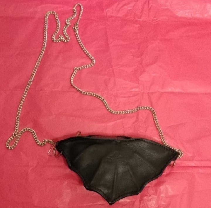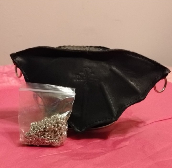 Stylish black leather bat pouch with a silver chain. Pouch is very small. Never been used. Good condition. Zipper works fine but does seem to get a little stuck in the crease when zipping and unzipping. Just needs to be done slowly.