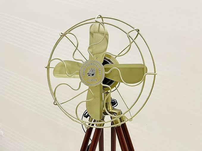The Royal Navy Adjustable Antique Floor Fan with Brown Wooden Tripod Stand is a striking and functional piece of home decor that combines vintage aesthetics with modern cooling technology. This fan is designed to capture the essence of classic naval and industrial design while providing efficient air circulation. - Key Features: Antique Design: The fan features an antique brass finish with intricate detailing, reminiscent of the golden age of maritime exploration. This design element adds a touch of timeless elegance to any room -. Adjustable Height: The brown wooden tripod stand is not only sturdy but also adjustable in height, allowing you to customize the fan's positioning to suit your needs. This feature ensures versatility and easy integration into various room settings. -Durable-Quality Craftsmanship: Crafted with precision and attention to detail, this fan boasts exceptional craftsmanship. The wooden tripod stand is carefully constructed to enhance stability and durability, while the antique brass finish on the fan's body exudes a sense of vintage charm. -Three-Speed Settings: The fan offers three-speed settings, allowing you to tailor the airflow to your comfort level. Whether you need a gentle breeze or a more vigorous cooling effect, this fan can, This feature helps in maintaining a consistent and pleasant temperature in your living space. Easy to Use: The Royal Navy Adjustable Antique Floor Fan is user-friendly, with simple controls that make it easy to adjust the settings to your liking. -Versatile Placement: The combination of its vintage aesthetic and adjustable height makes this fan suitable for various settings, from living rooms and bedrooms to offices and study spaces. It can complement a range of interior design. -Product Dimensions :109D x 50W x 109H Centimeters