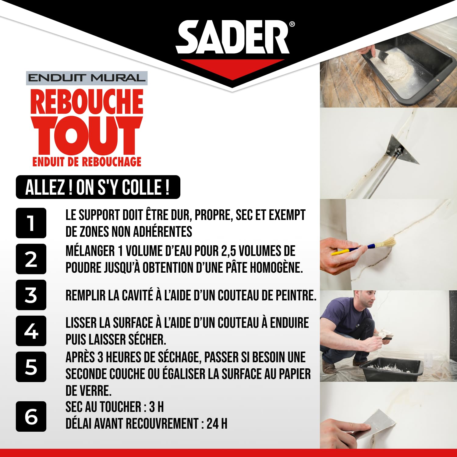 The Sader Rejoint All Powder Sealant is designed to effectively seal holes, cracks, cavities and scratches up to 5cm deep in one go. It is suitable for all interior surfaces: plaster, concrete, cement, brick, masonry, plasterboard, untreated or painted. Easy to apply and smooth, provides excellent hardness without shrinkage or cracks when drying. Ideal for wall renovation work, it ensures a clean and long-lasting result.