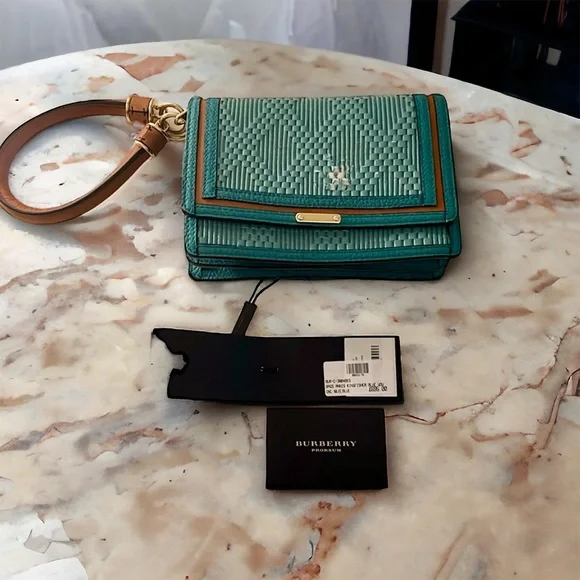 SEE IMAGES - Some Damage BURBERRY Prorsum Kingfisher $850 Retail Bag Wristlet Clutch. Some damages to bag please see all images before purchase (great investment piece to fix and reposh. Stunning craftsmanship. Woven turquoise and beige leather. Goldtone hardware. Flap closure Fabric lining. Size appr.7.5x5.5x2.