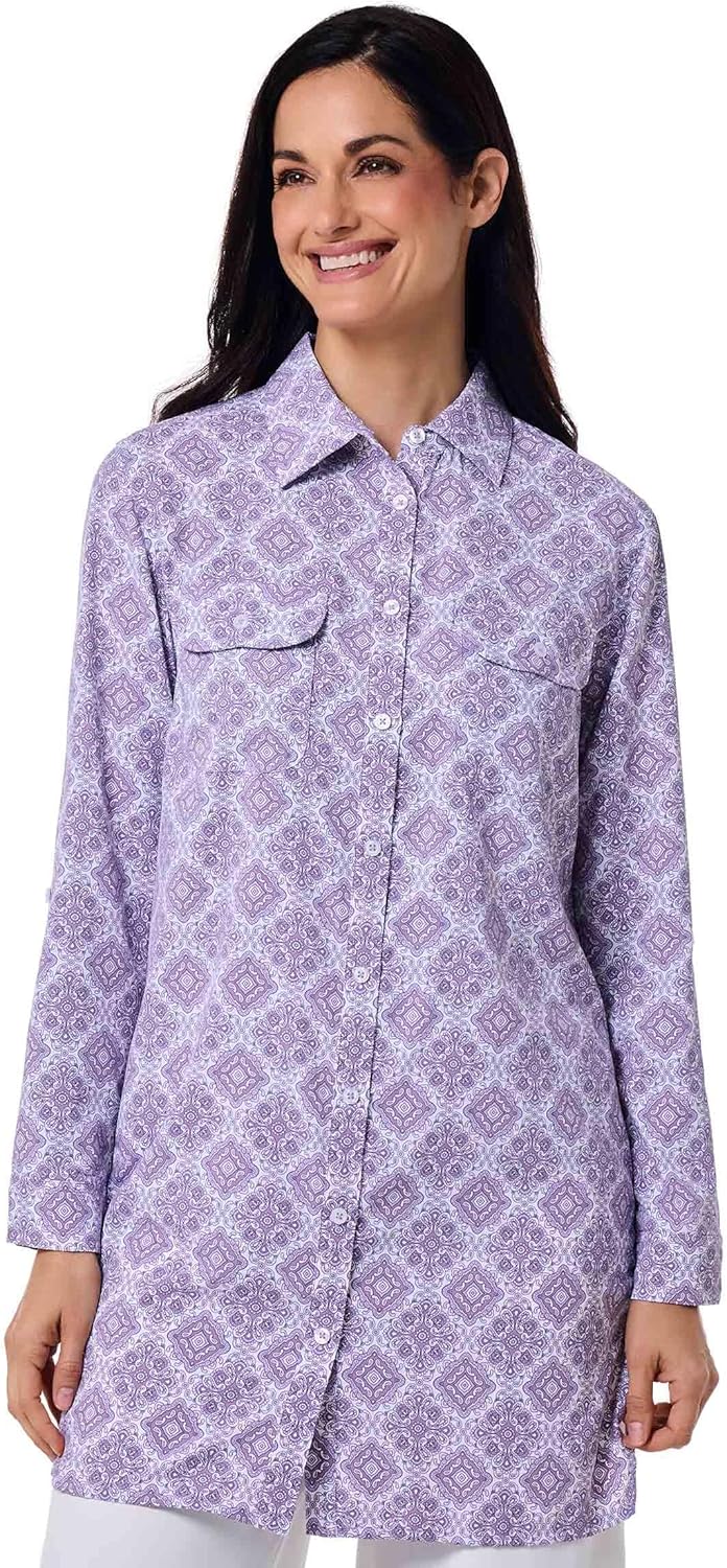 From sunrise to sunset, let the classic look of our button-down Santorini Tunic Shirt take you from the most secluded beach to a summer garden party with stylish ease. The buttery-soft, lightweight Aire fabric of our tunic shirts will comfort you in warm weather and shield you from harmful UV rays with a timeless look that never fails. Front breast pockets are perfect for sunglass storage or beachcombing treasures. Our relaxed fit beach shirt is perfect for layering over a tank top or swimsuit and under your favorite wrap all year-round.