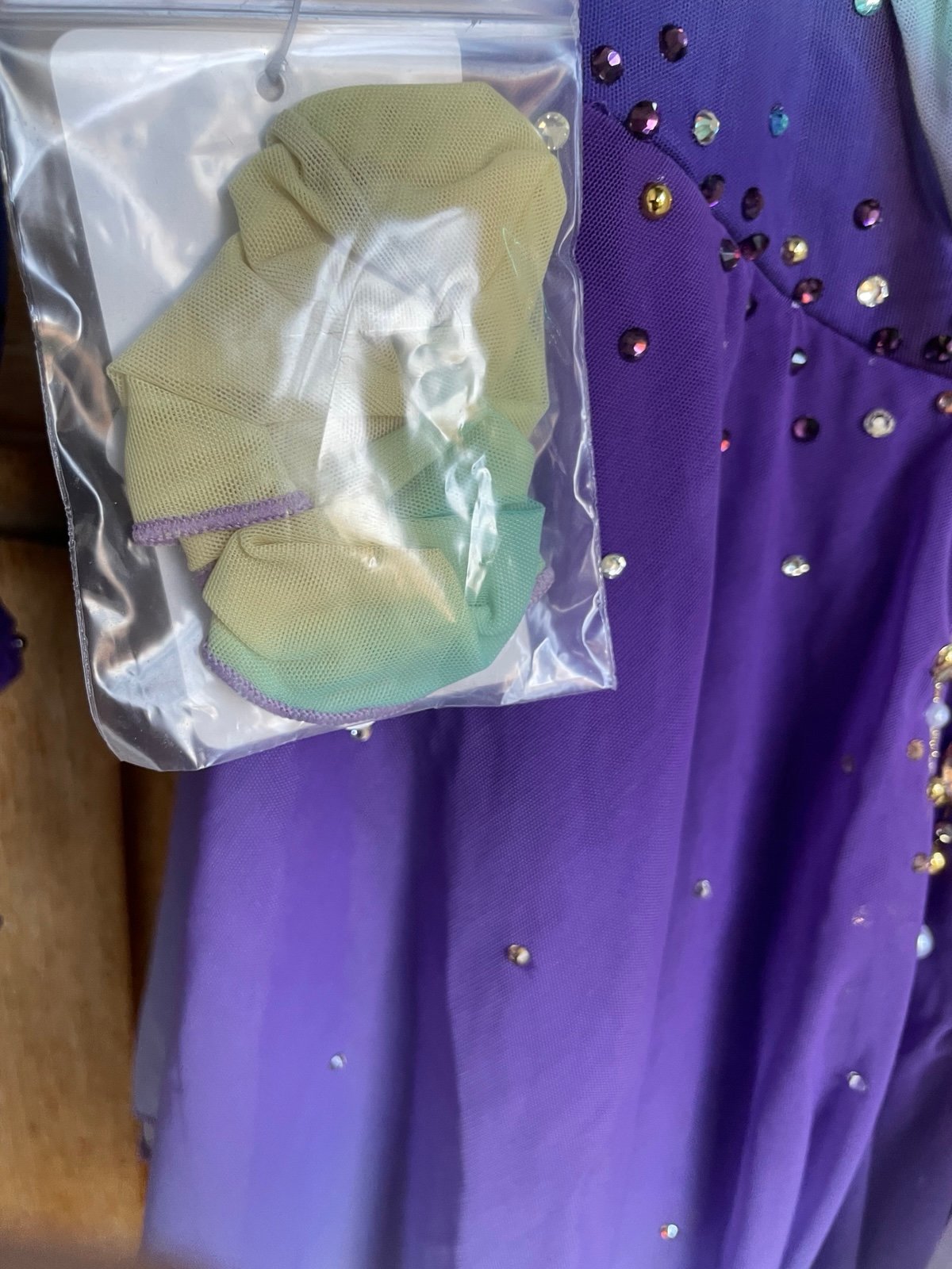 Stunning competition-grade figure skating dress by 冰火之舞 in Teen Size 16. Features a professional airbrushed ombré gradient from teal and lime to deep violet, accented with high-density AB rhinestones across the bodice, sleeves, and multilayer chiffon skirt.