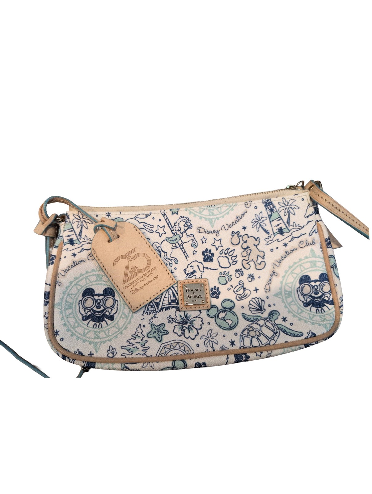 Celebrate the magic of Disney and the craftsmanship of Dooney & Bourke with this Disney Vacation Club 25th Anniversary Crossbody Bag. This limited-edition piece was released exclusively to commemorate 25 years of Disney Vacation Club and features a playful, resort-inspired pattern in blue and teal tones on a cream background.