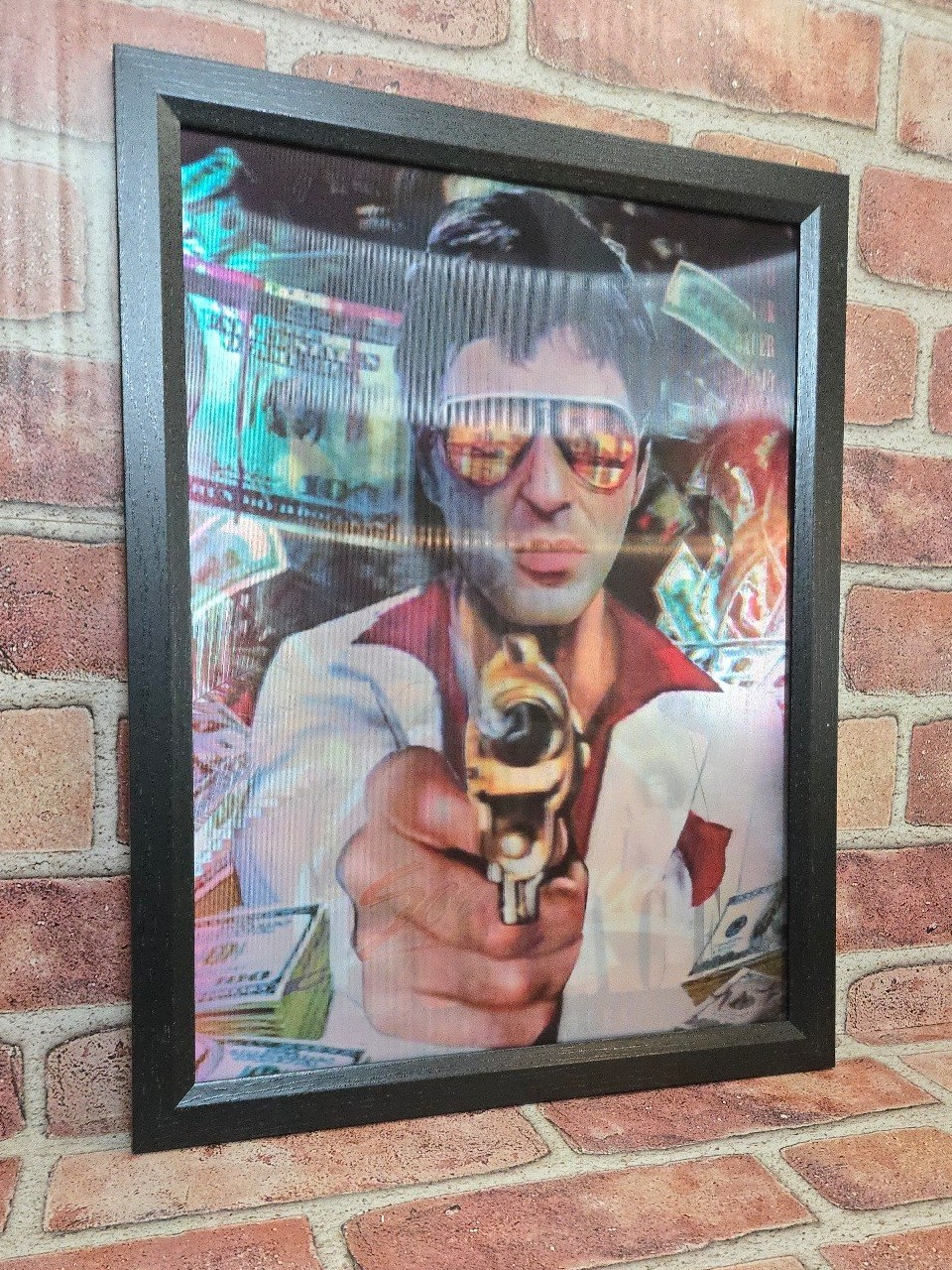 Step up your wall game with the Scarface Holographic Flex—a triple-threat masterpiece that shifts through three iconic Tony Montana moments depending on your angle. From the kingpin’s throne to his deadly golden stare, this framed holographic art is pure boss energy, guaranteed to keep heads turning and hustlers inspired.