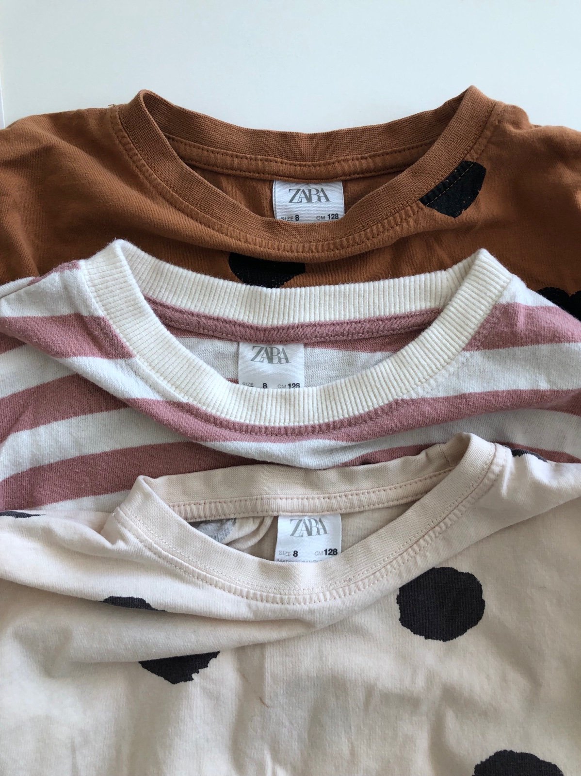 •3 Zara Long sleeve shirts (tagged size 8 but shrunk to 7/8 in dryer) my daughter is a true size 8 in shirts now and these are too small. These are a true 6/7!!