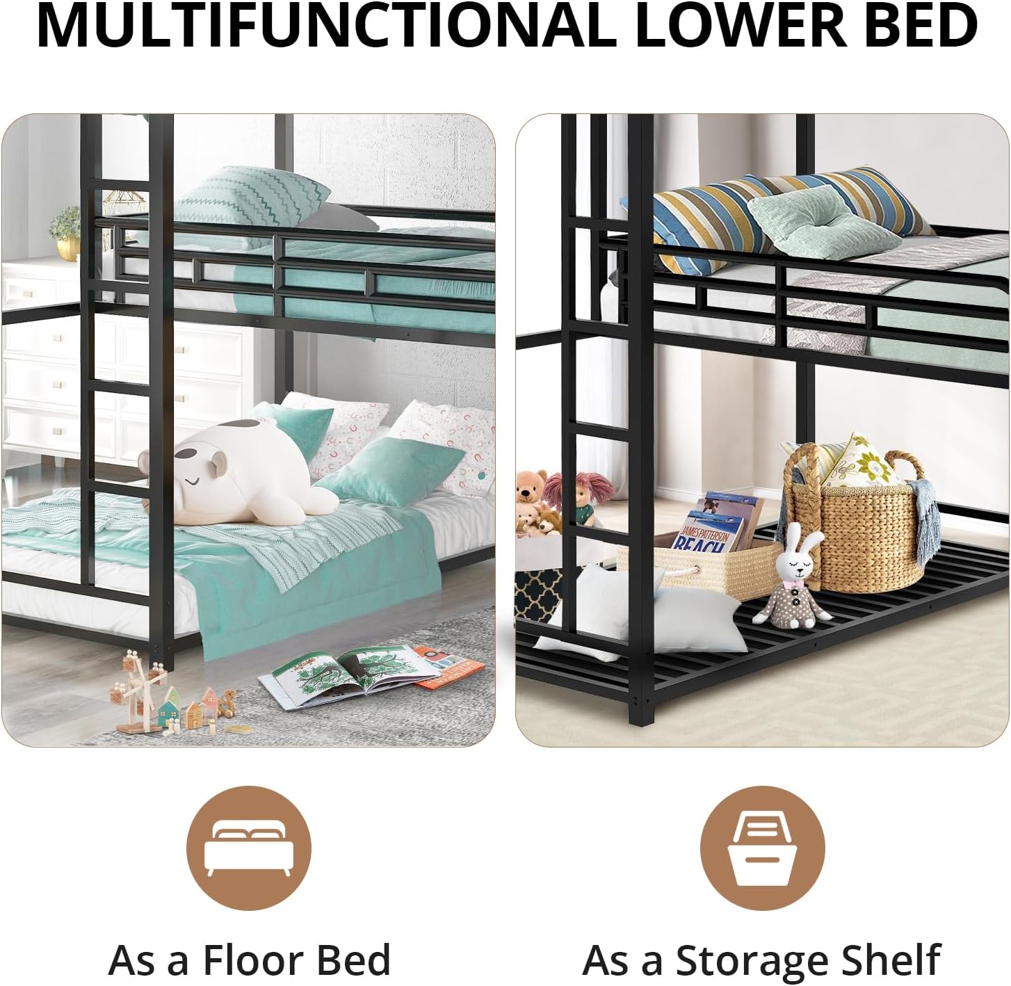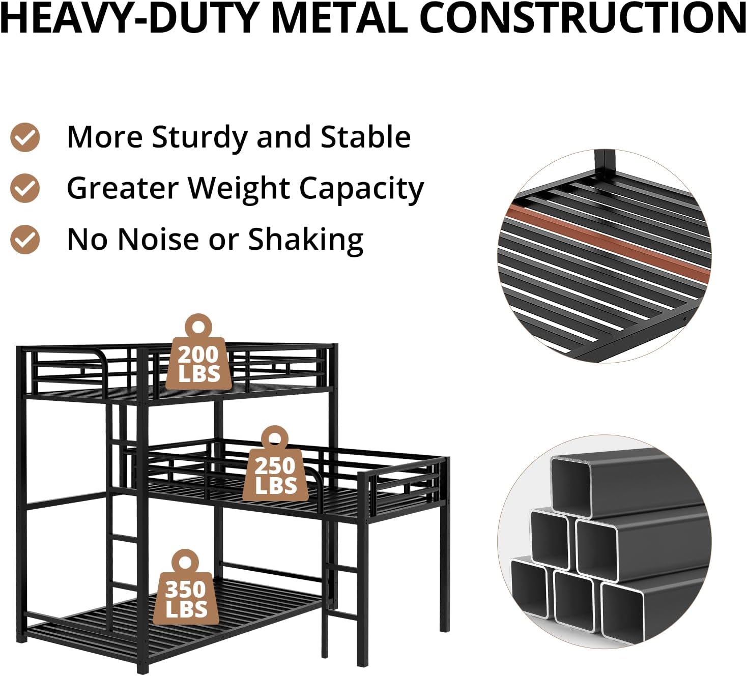 A versatile, unique style L-shaped triple bunk bed. Constructed of high quality heavy duty steel for optimum durability and high load capacity, ensuring longevity. 21 solid steel slat blend naturally into the bed frame so box springs are not required. This L-shaped triple bunk bed is designed with a clean silhouette and a hue of elegance. It suits all styles of home decoration and completes the look of any bedroom.Specification:Size: TwinColor: BlackMaterial: MetalNumber of Slats: 21pcsSpring Box: No needNumbers of Package: 1Assembly Required: YesWeight & Dimensions: Overall Product Dimension: 78''L*78''W*74.1''HTotal Height: 74.1''Overall Product Weight: 126lbUpper Bunk Bed Weight Capability: 200lbMiddle Bunk Bed Weight Capability: 250lbDown Bunk Bed Weight Capability: 350lbRecommend Upper/Middle/Down Bed Mattress Thickness: 6''/6''/8''Kind Remind:1. Manual measurement has been used, there may be some reasonable error.2. Product pictures are for reference only. Real product's color may be a little different from the image due to the lighting or monitor's display.3. Due to the large size of the product and inconvenient transportation, once the order has been shipped, we only accept the return requests due to quality issues.Hope you can understand.