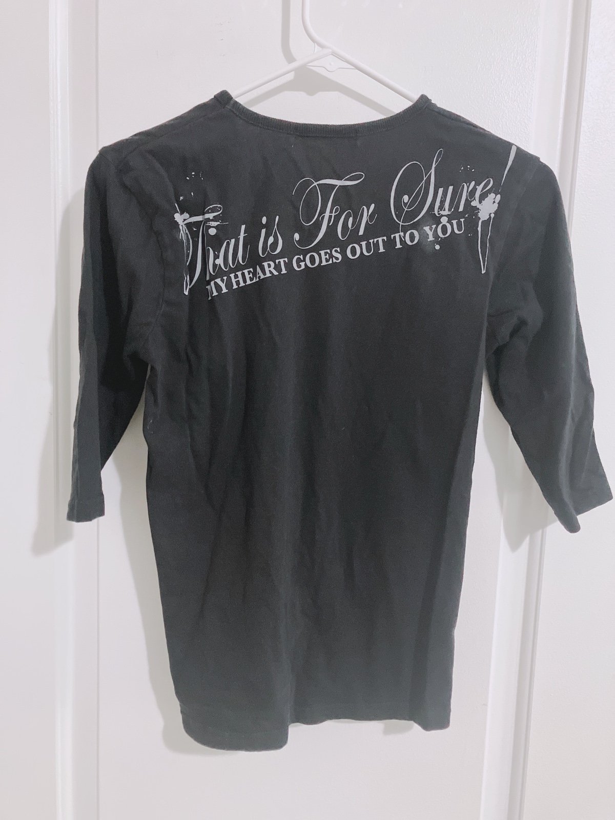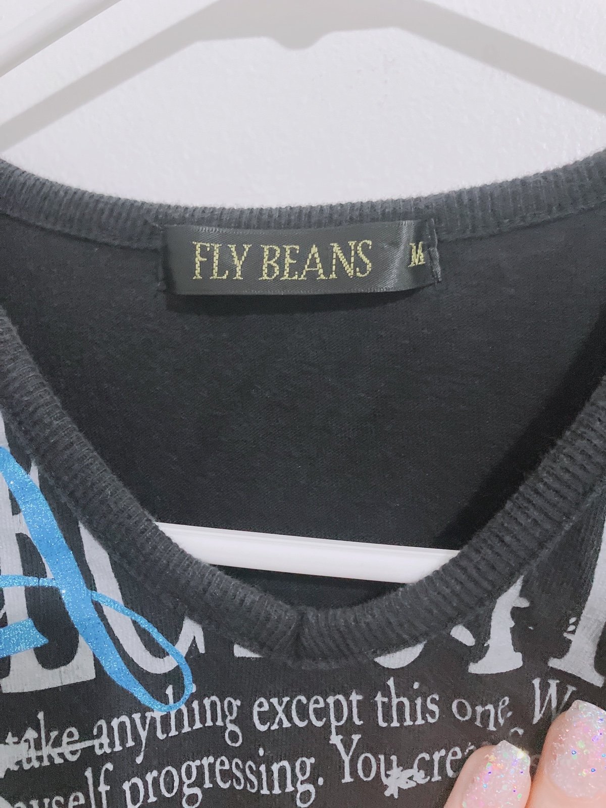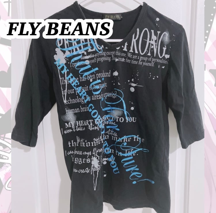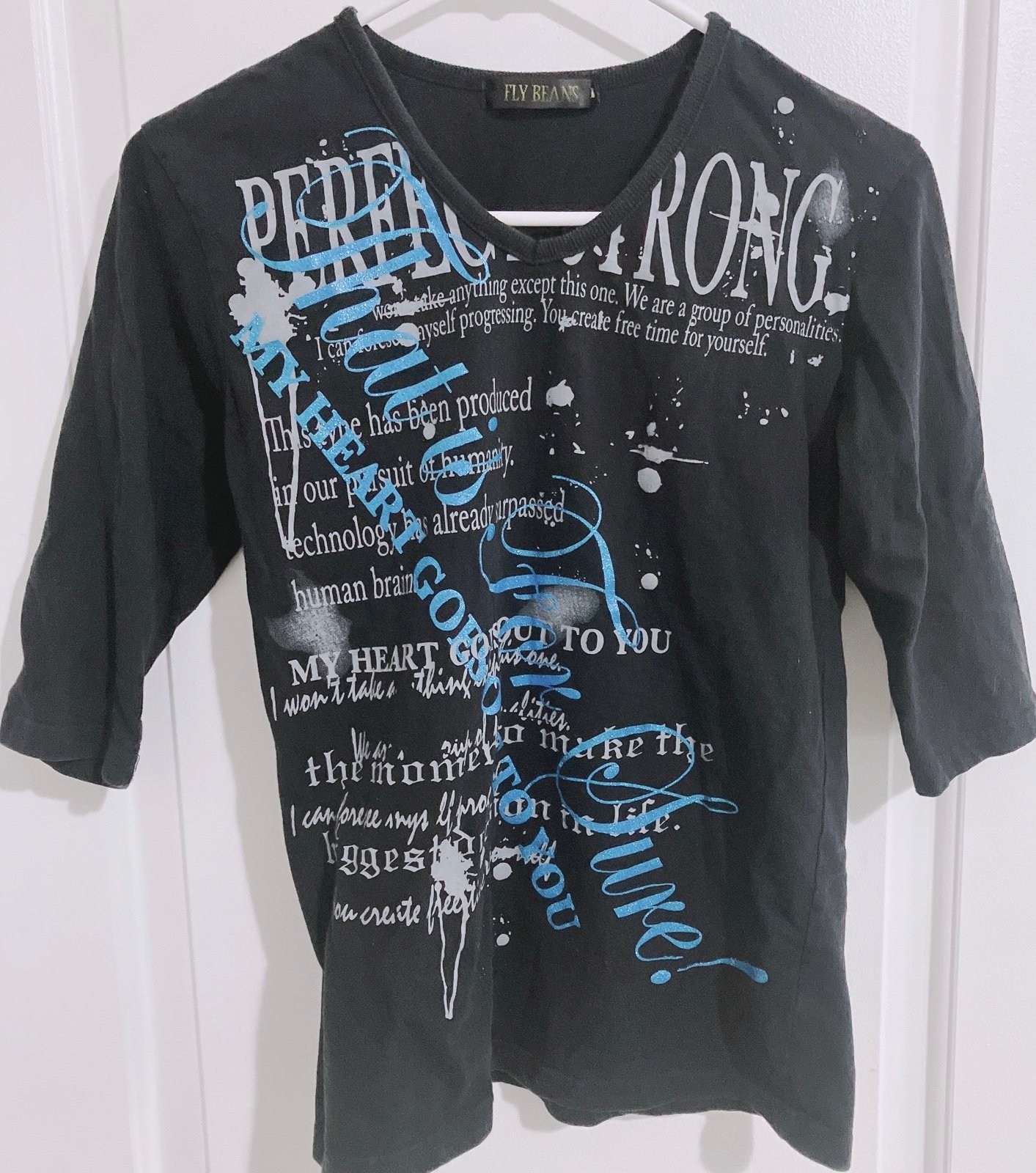 ITEM ⟡ japanese brand fly beans graphic text with blue glitter words 3/4 sleeve v neck shirt