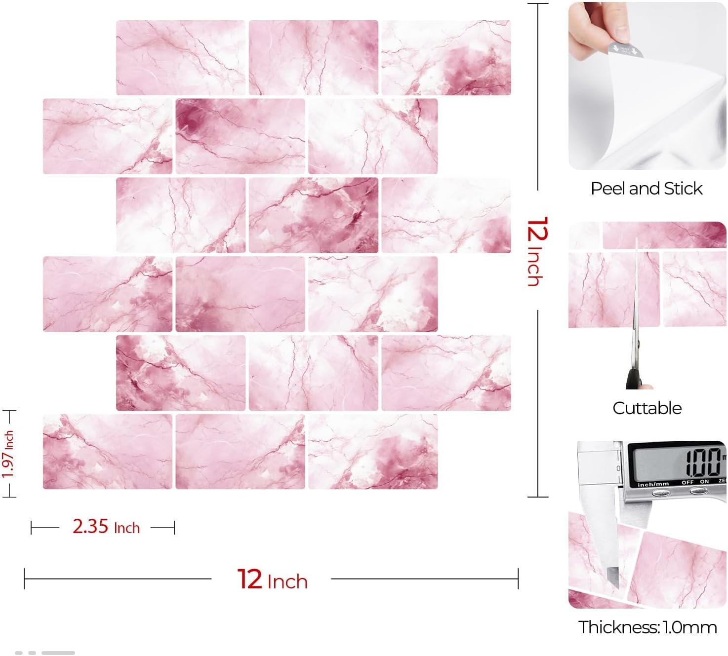 🏡 Detail: Qty:16-tiles, peel and stick backsplash pink tile, 3d marble subway tile design, easy to clean and cut, made of vinyl & clear gel, waterproof, removable, heat resistant, self adhesive. Size: 12x12 inch/tile, Thickness: 1.0mm. 🏡Peel and stick tile: The self adhesive back means you simply stick on the wall. The wall tiles are made of vinyl and can be adapted individually to the right size using a cutter knife. It's easy and inexpensive way to makeover your kitchen or bathroom in minutes!🏡Renter friendly backsplash: Use a hair dryer to soft the tile adhesive, start at the corner of the heated tile and use a putty knife to lift the edge, don't lifting it straight, peel it at a 30-degree angle to prevent any damage to the wall.🏡Heat resistant backsplash: Designed for kitchen wall and bathroom baksplash, the tiles are resistant to the heat of stovetops andthe humidity of bathrooms. Withstand kitchen temperatures without warping, cracking, or discoloring.🏡Multi-purpose: Pink peel and stick tile for bathroom, pink peel and stick backsplash for kitchen, pink peel and stick tiles for walls, pink backsplash for kitchen wall, self adhesive backsplash for bar, peel and stick tile for fireplace, removable backsplash for renters, peel and stick tile for shower walls, pink sticky tiles for laundry room.