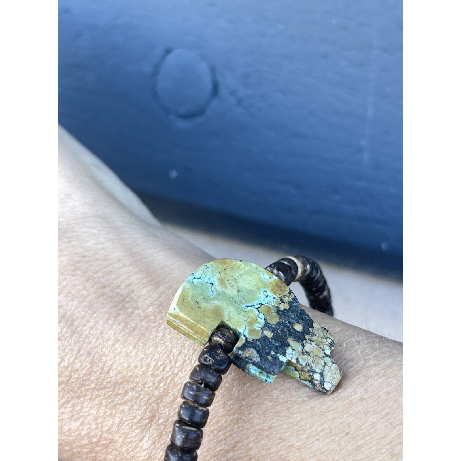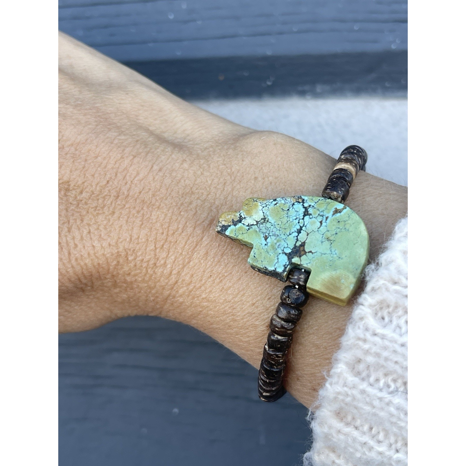 Spiderweb turquoise bear bracelet, vintage turquoise cuff, Southwestern jewelry, heishi bead bracelet, turquoise bear fetish, boho cuff, Native style bracelet, turquoise stacking cuff, green turquoise jewelry, flexible cuff bracelet, vintage heishi bracelet, turquoise totem cuff, artisan turquoise jewelry