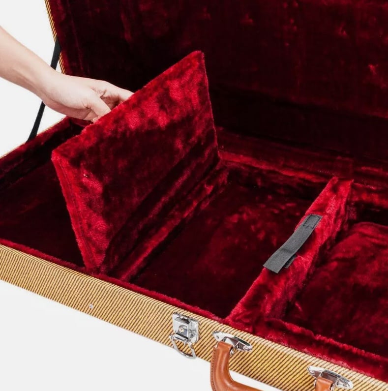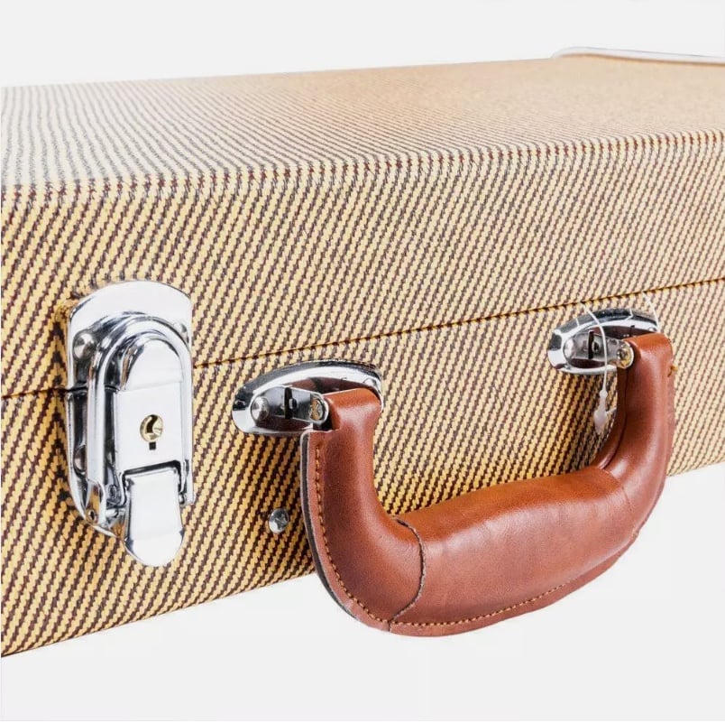 1. Lockable wood hard case with plush lined interior that includes extra neck and bridge padding