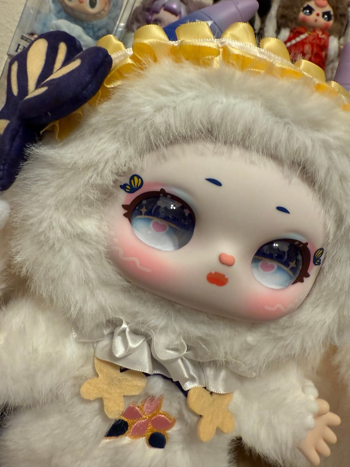 This gorgeous bunny has butterflies embedded on her ears and a flower on her belly. She also has butterflies on her headband by her ears and beautiful butterfly wings!