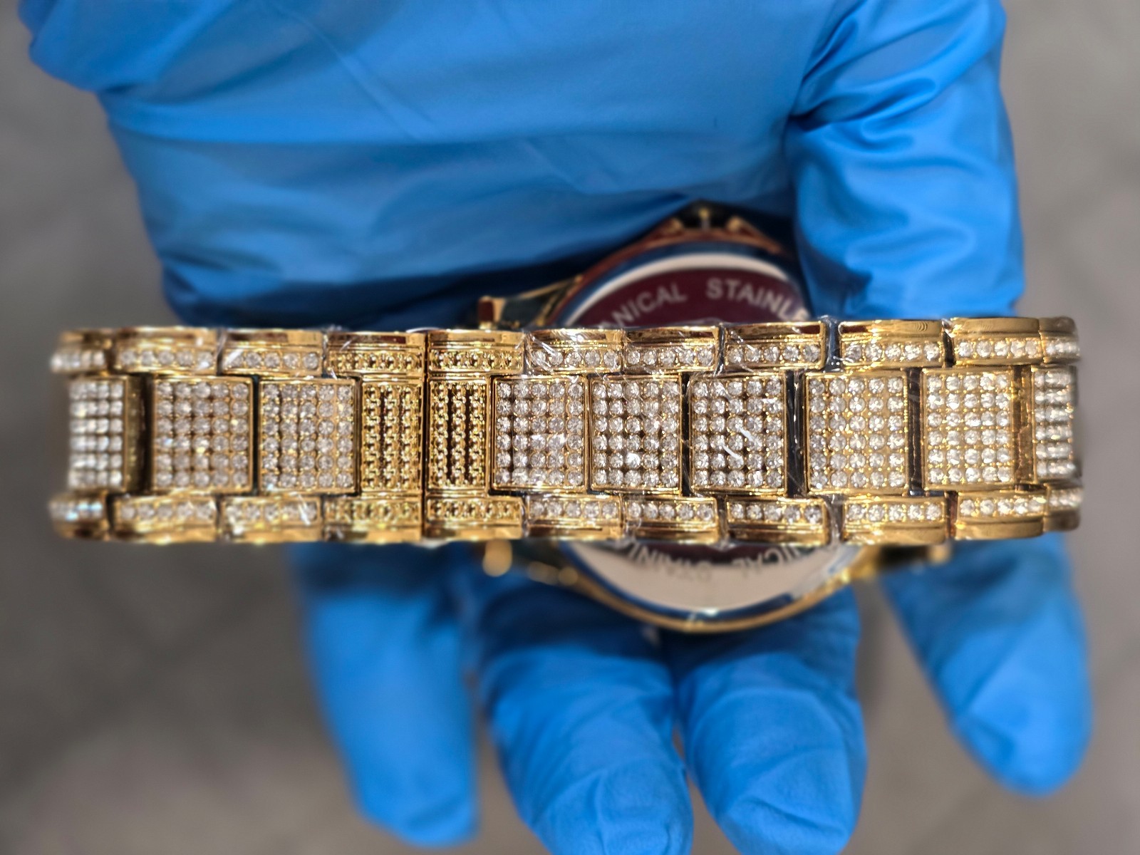This is brand new jumbo iced-out watch with a 45mm case, a gold-finished copper body, and a stainless steel back, all adorned with high-quality cubic zirconia stones. brand new with out tag.Paper protector on watch. Buy with confidence. #jewelry #cubiczirconia #stainlesss #men #unisex . To keep your jewerly at its best use a jewerly sealant to protect it and coat it.