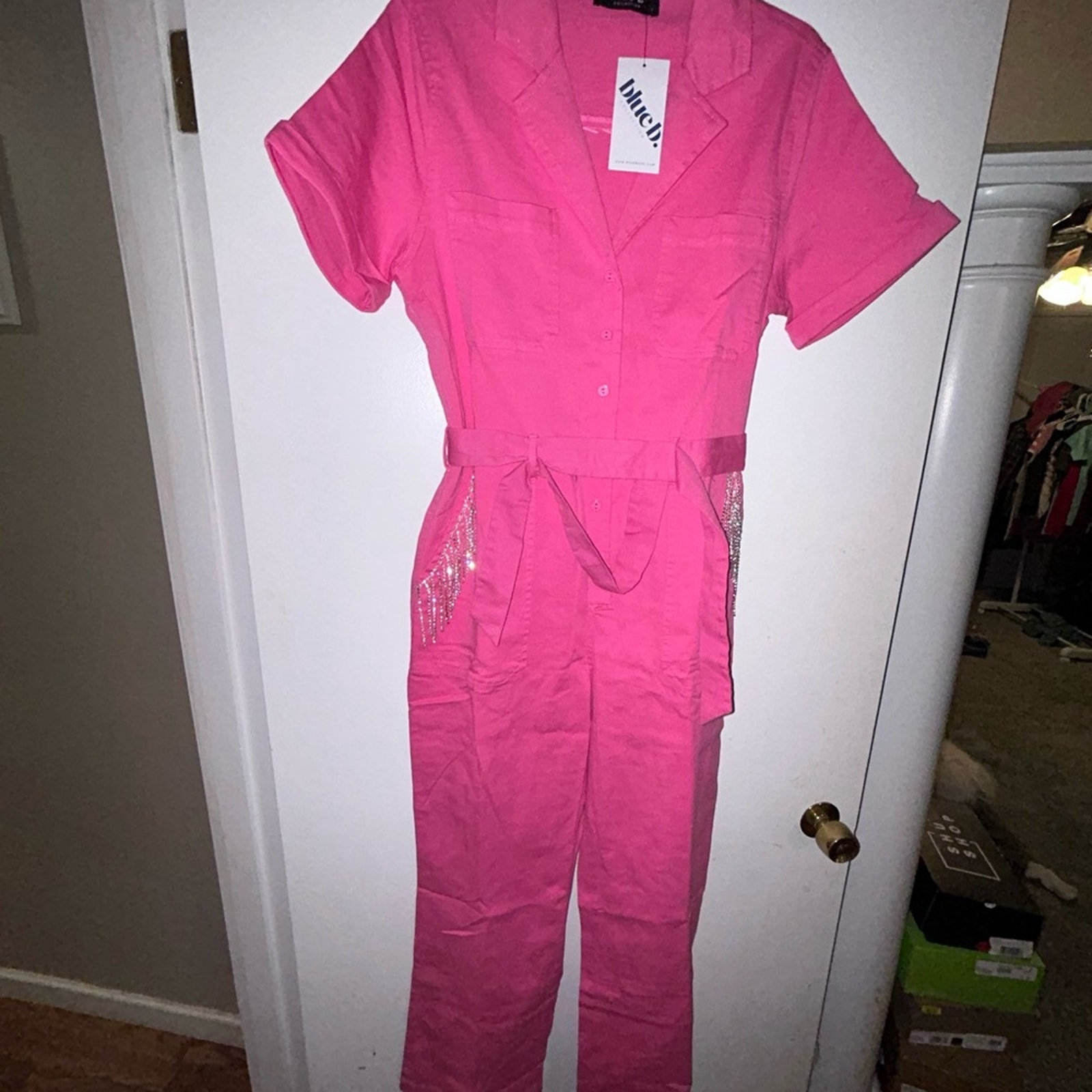 SHOWSTOPPER Elevate your style with the Pink Women's Jumpsuit. This chic piece features a vibrant pink color, perfect for making a statement. Ideal for any occasion, it combines comfort and fashion effortlessly. Wide leg and bling fringe with pockets and belt awesome one of a kind .. showstopper