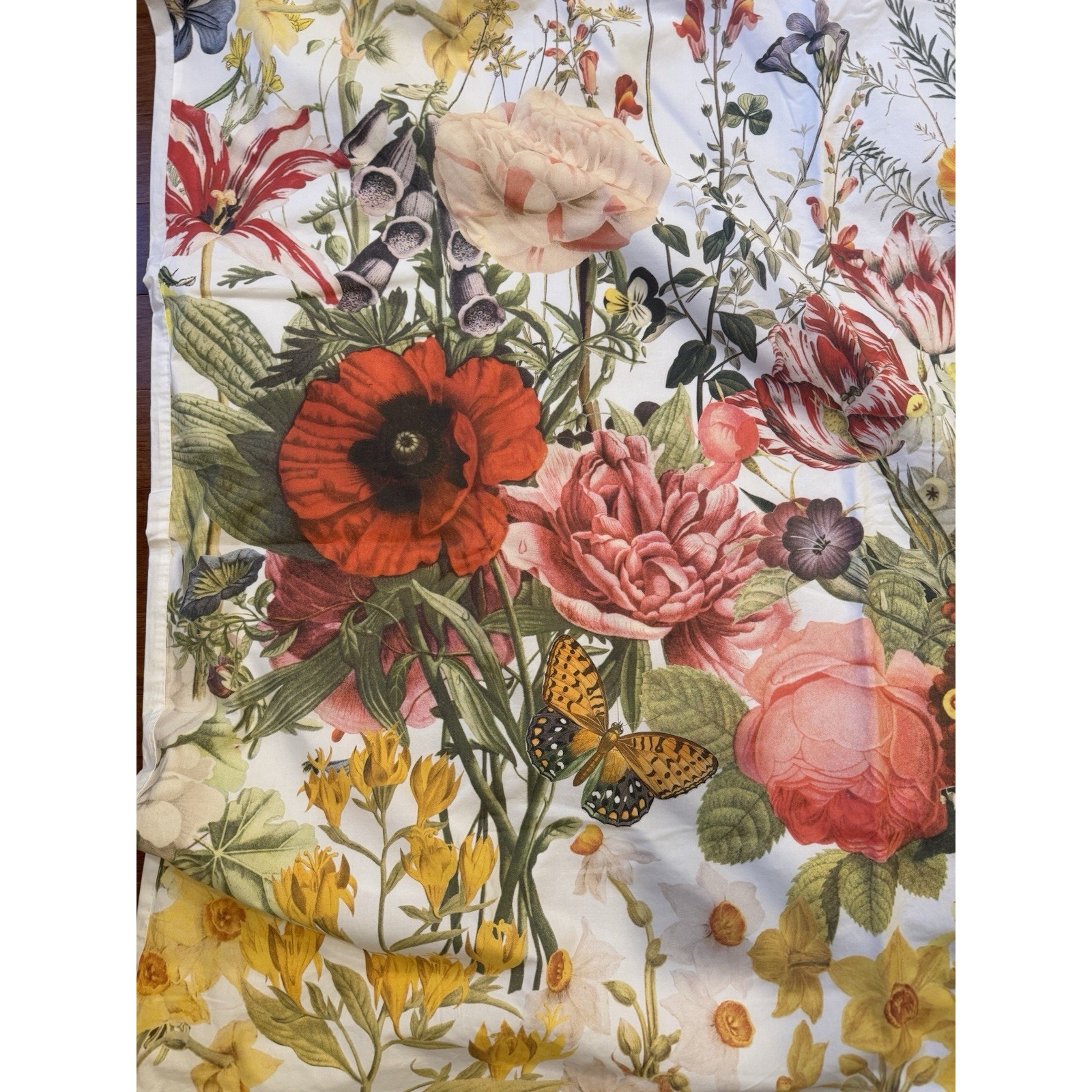 The Pottery Barn FLORA Print King/Cal King Duvet Cover & Shams set features a beautiful floral garden pattern in a French Country style. Made from 100% cotton, this three-piece set includes a duvet cover and two shams, perfect for adding a touch of charm to any bedroom. The multicolor design adds a vibrant and elegant touch to the room, making it a stylish choice for those looking to update their bedding.