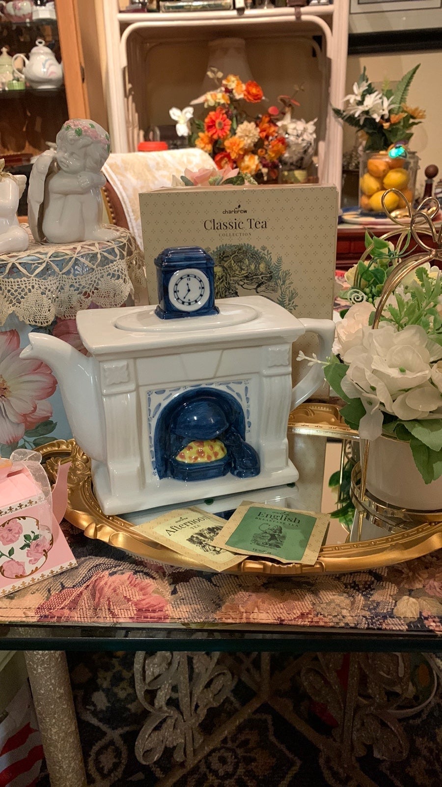 White and Navy Blue Porcelain Teapot Hearth with a Mantel Clock Lid Handle and Navy Blue Cat Warming itself by the Fireplace. Cat scene is on both side of Teapot. Lovely carved designs in Fireplace. Unmarked, but; Made in Thailand Sticker is on Bottom of the Teapot. It Holds 5 Cups ( 40 ounces) Perfect for Your Next Teaparty or Luncheon.