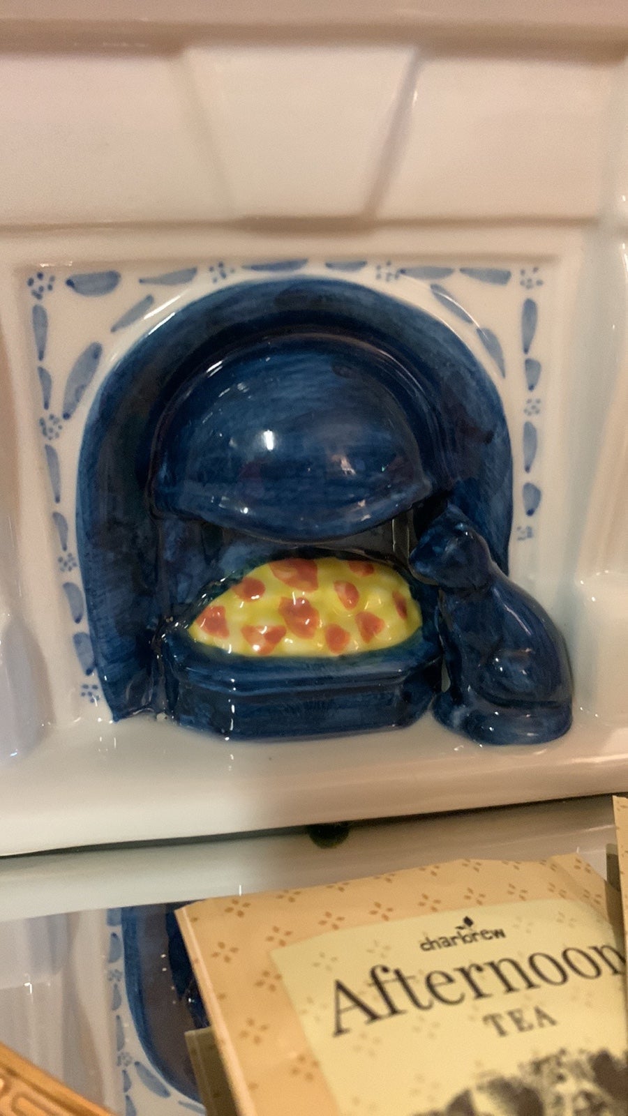 RARE! Teapot Hearth Mantel Clock w/ Cat Warming by Fireplace. White and Blue.