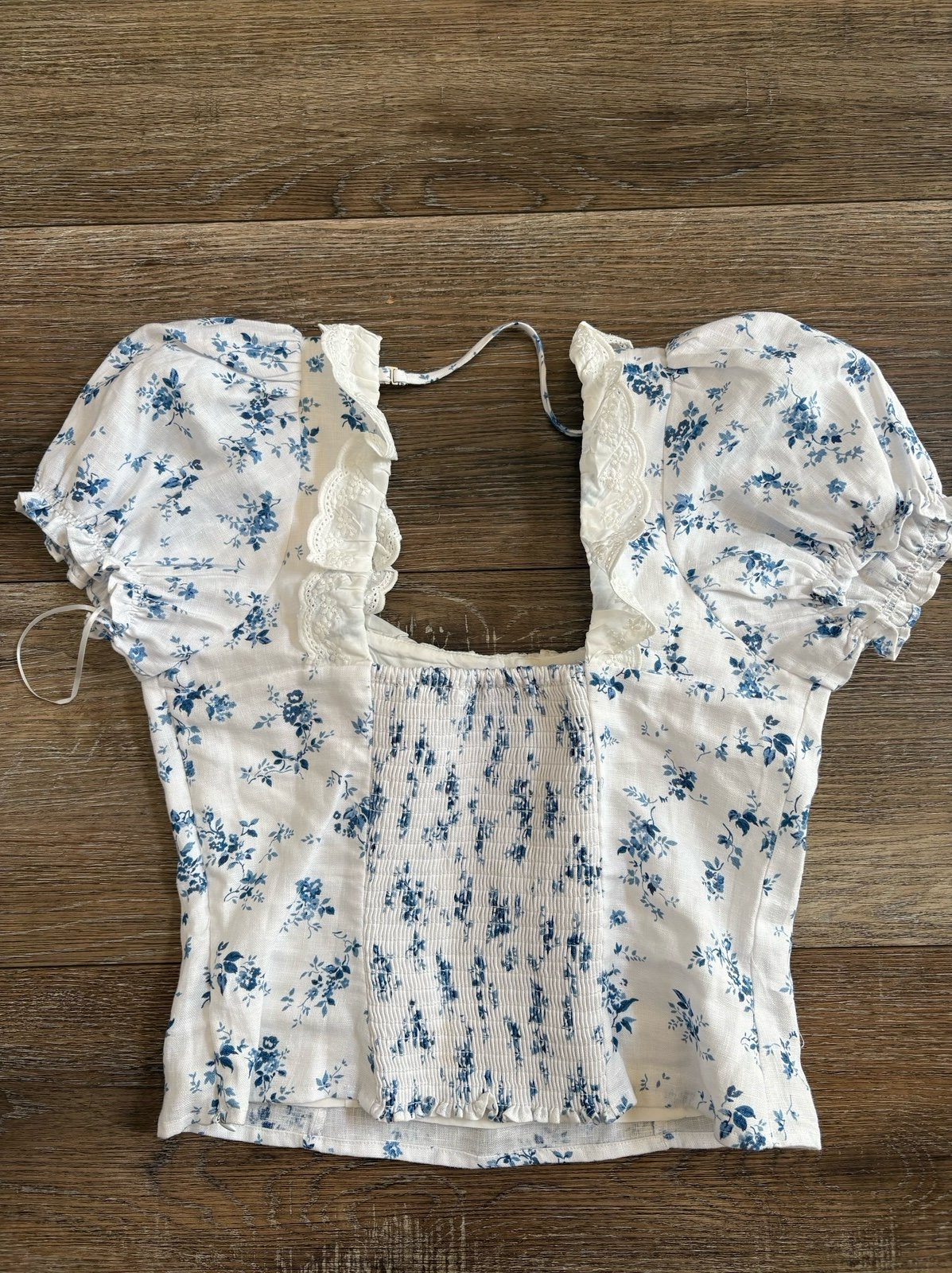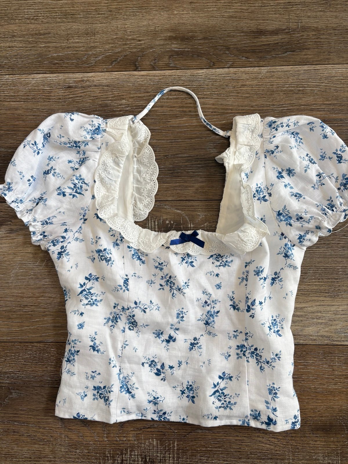 New without retail tags. Retail $168 and current style. Reformation Alice 1005 linen lace trim puff sleeve crop top in color orlaya(white with blue floral). Size 10. Top is fully lined in rayon, has touched back, and a side zipper. Hand wash cold recommended.