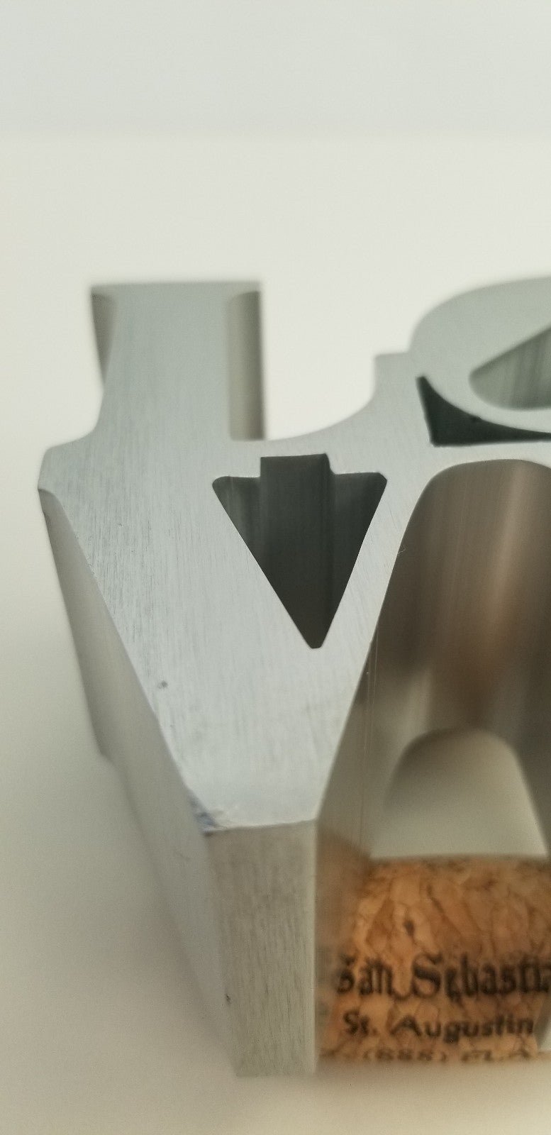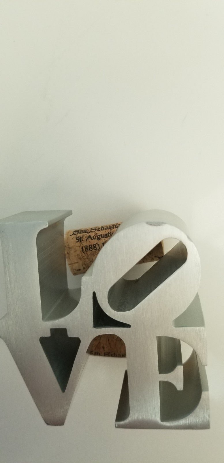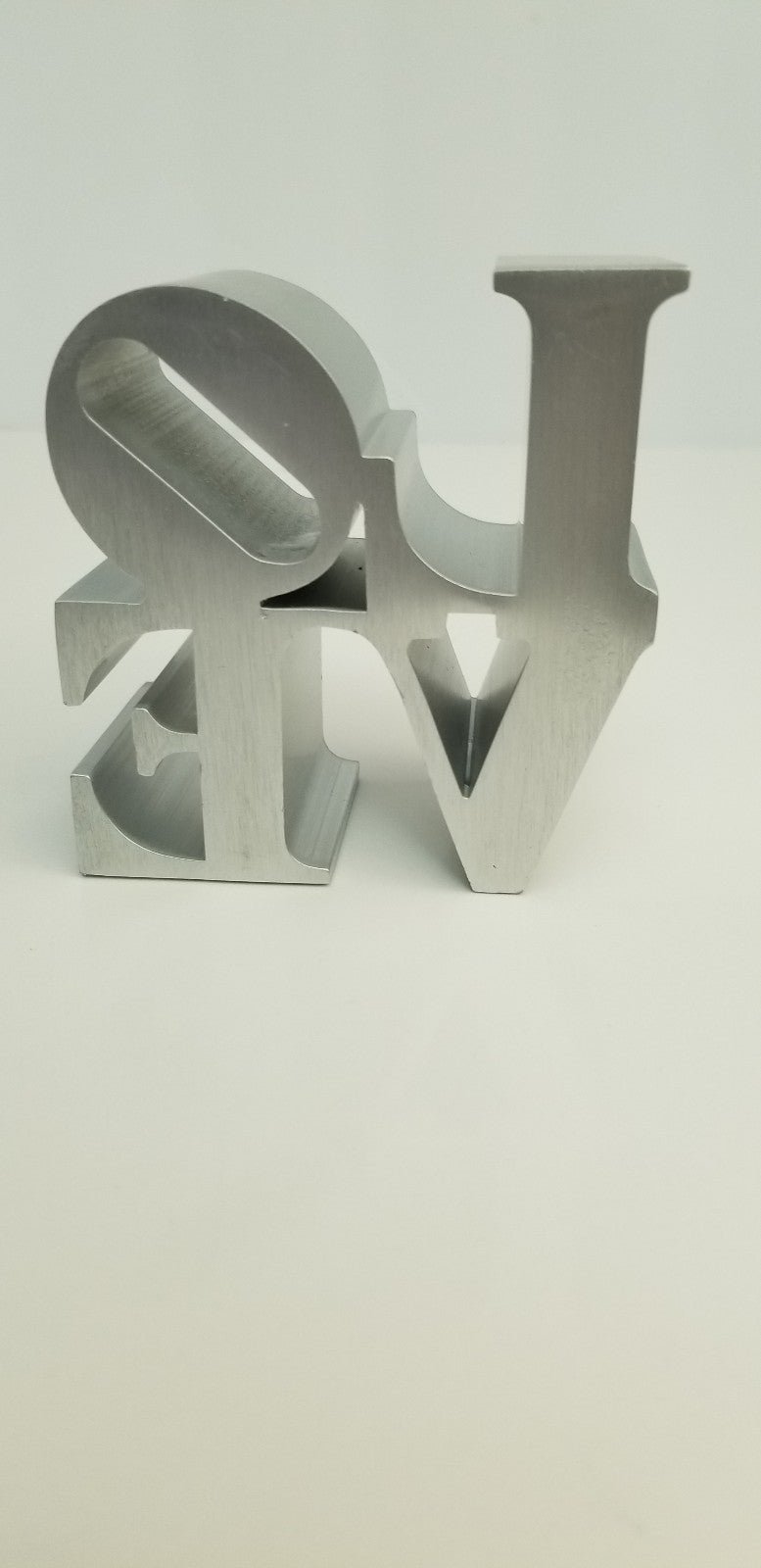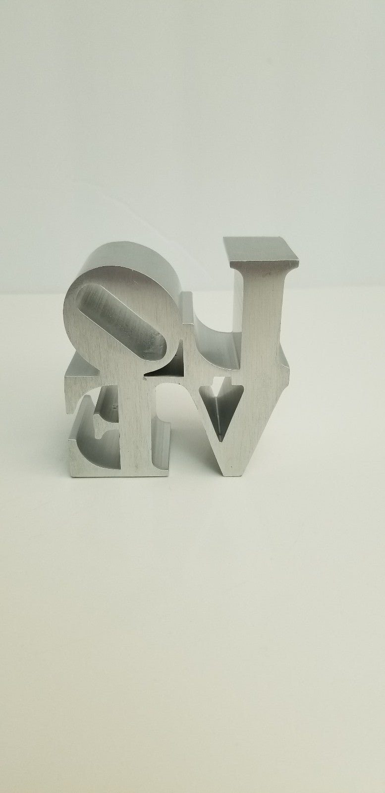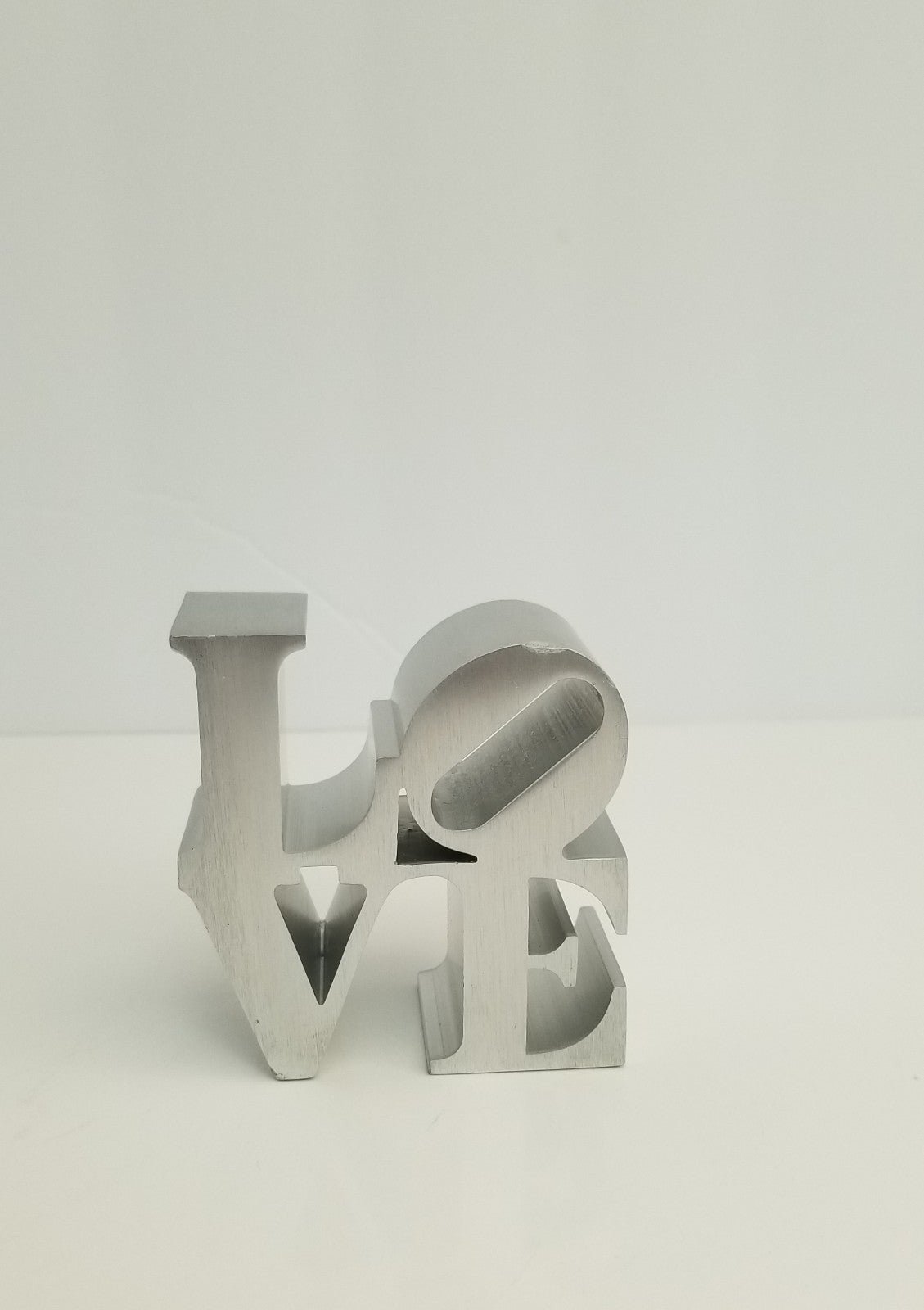 This mini replica of Robert Indiana's origional iconic pop art LOVE sculpture is made of aluminum. The original is located in John F. Kennedy Plaza "Love Park" in Philadelphia. This sculpture stands 3" high, 3" wide and 1.5" deep. See the pictures for the 2 dings, one on the top of the O, and the other on the bottom of the V. Please