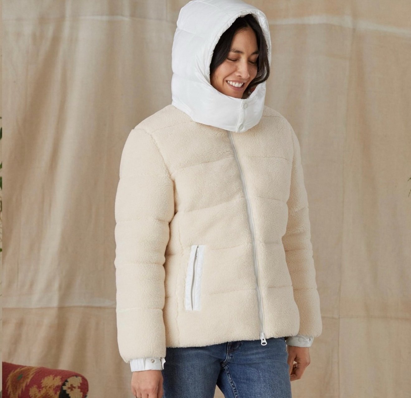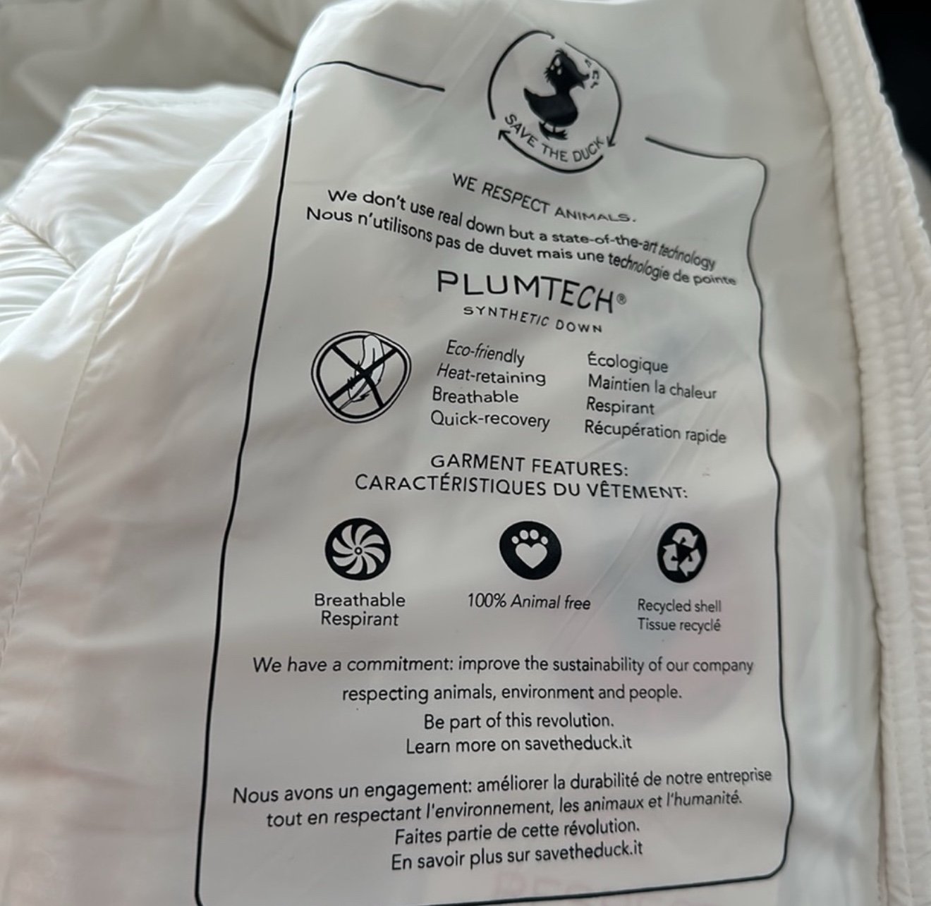 Hooded puffer coat featuring quilted details, easy zipper closure, zippered front pockets, recycled materials and an animal free design. Enjoy the best of both worlds with unique technology that mimics the loft of down, and the exceptional advantages of technological thermal lining. Hood is removable. Polyester/nylon. Hand wash. Size XS (0 to 2). Back approximately 25" long.