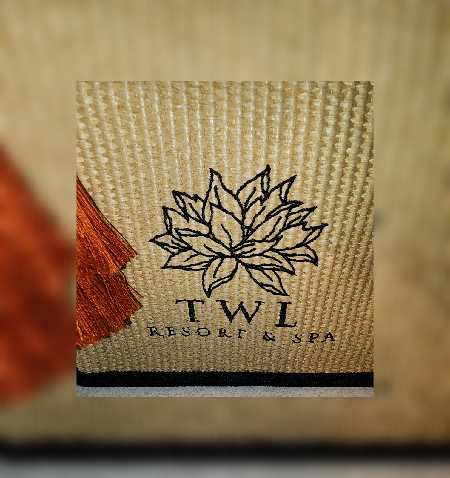 Packaging: A beach tote bag with "TWL RESORT & SPA" on the front and a playful "Do Not Disturb" door hanger.
