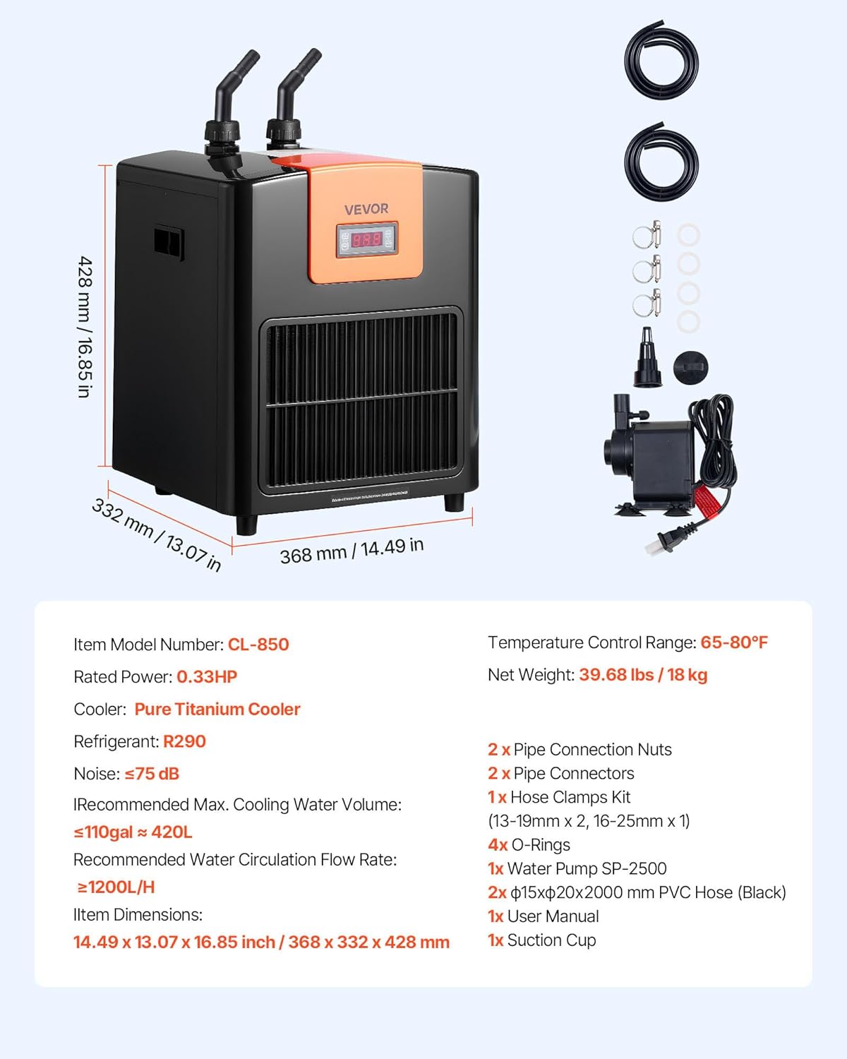 | Item Type Name | 1/3 HP Water Chiller for Hydroponics, Fast Cooling for Fish Tank,Axolotl,Coral Reef,Quiet Refrigeration Compressor, Titanium Evaporator,Complete Fittings |