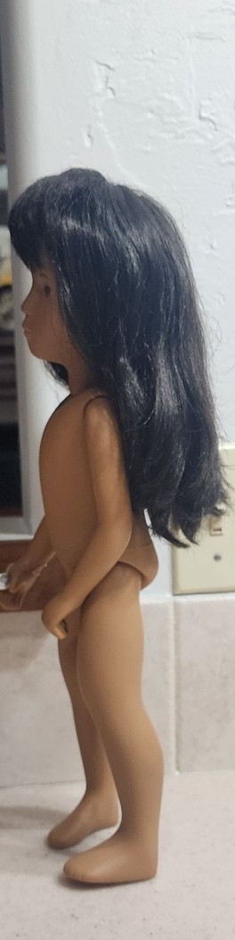 She is vinyl, black hair. She has her wrist tag. She does stand on her own , but limbs are a little loose.