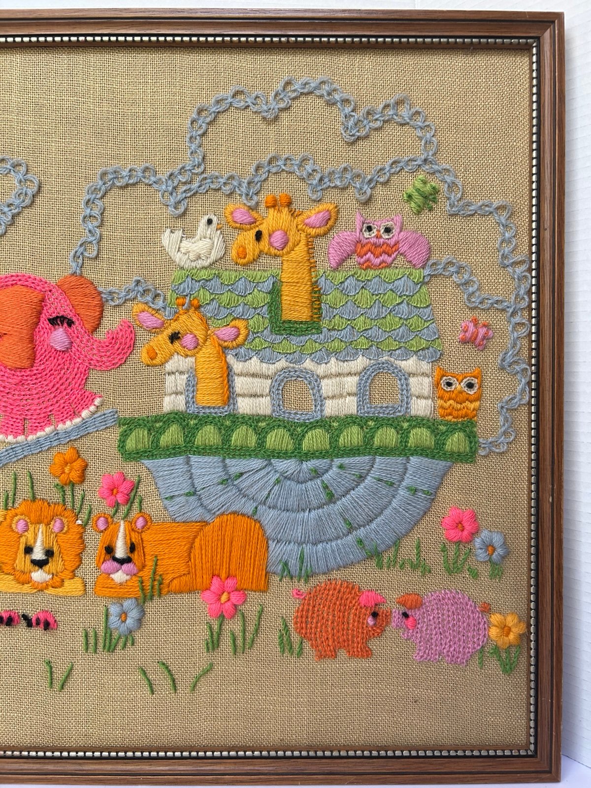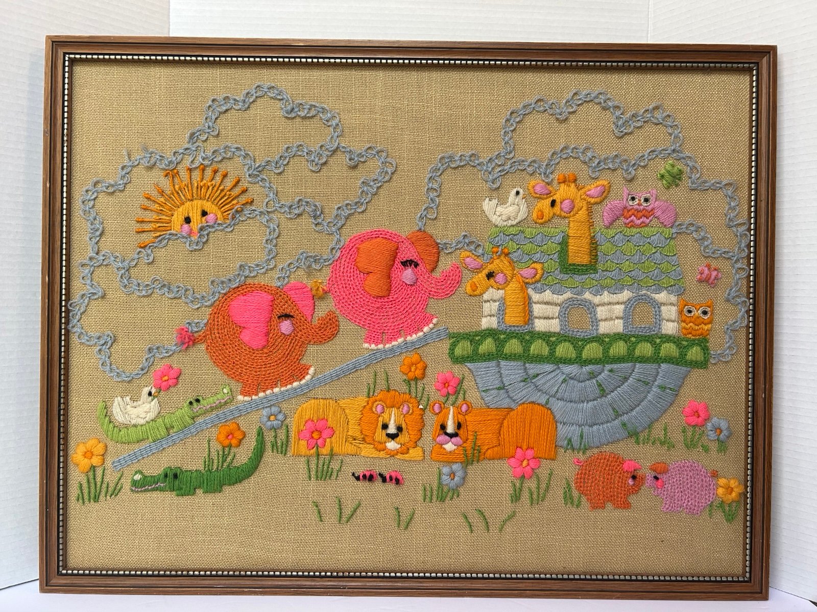 Adorable Vintage 1970s completed and framed Noah’s Ark crewel needlepoint.