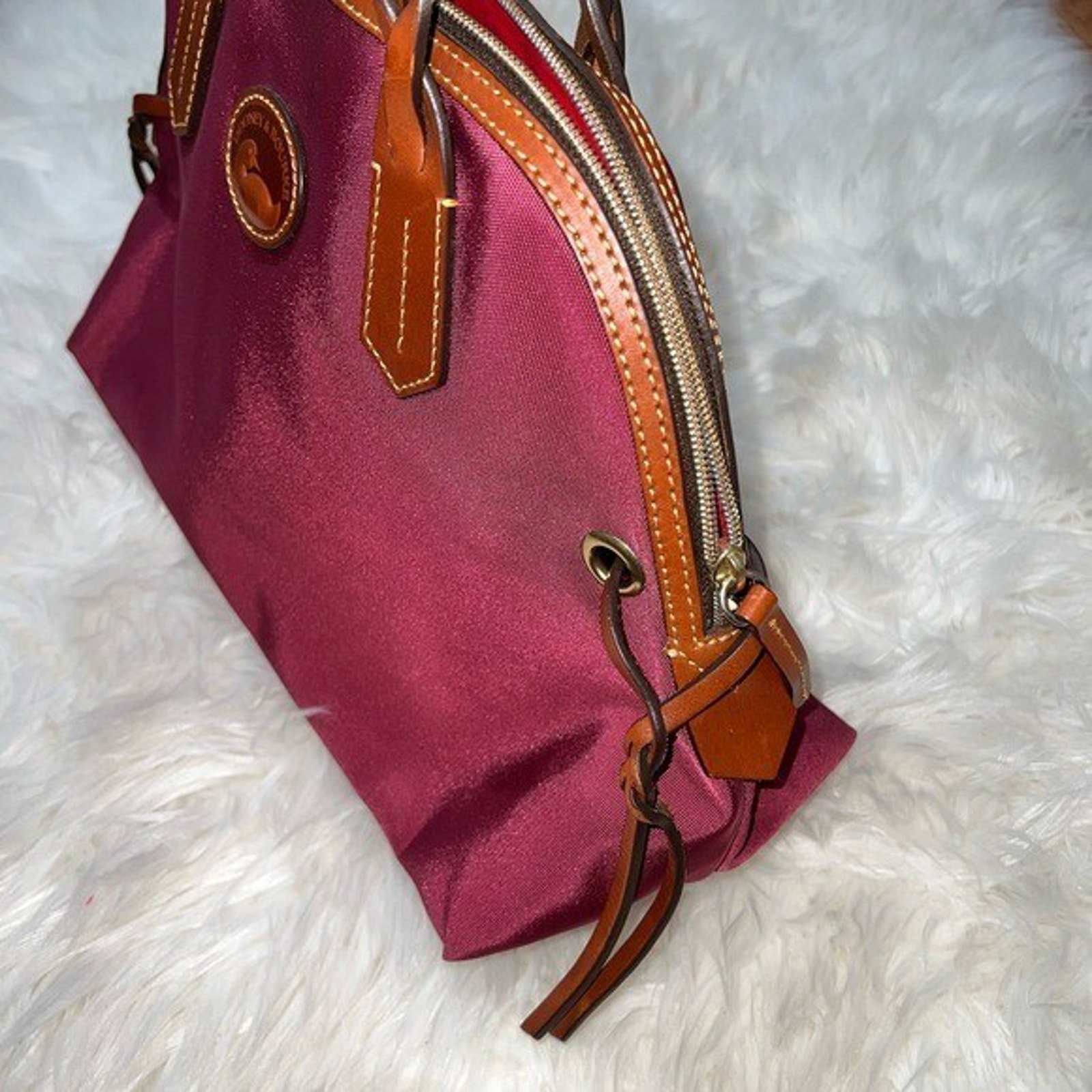 The Vintage Dooney & Bourke Medium Domed Satchel Model bag J829176 is a classic rectangular satchel/top handle bag made of pebbled canvas in a medium size with a purple exterior color. It features gold hardware accents, brown leather double handles, and a zip closure. The bag includes inner pockets, a bag charm, and is part of the Dooney & Bourke Pebble Grain product line, made in the United States. This timeless piece is perfect for everyday use and adds a touch of vintage style to any outfit.