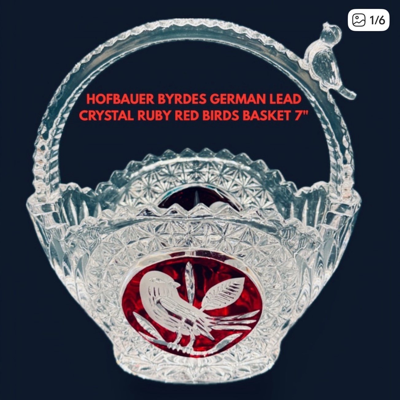 Elegant German crystal basket featuring a striking red bird design. Perfect for home decor No chips, cracks, hairlines or repairs