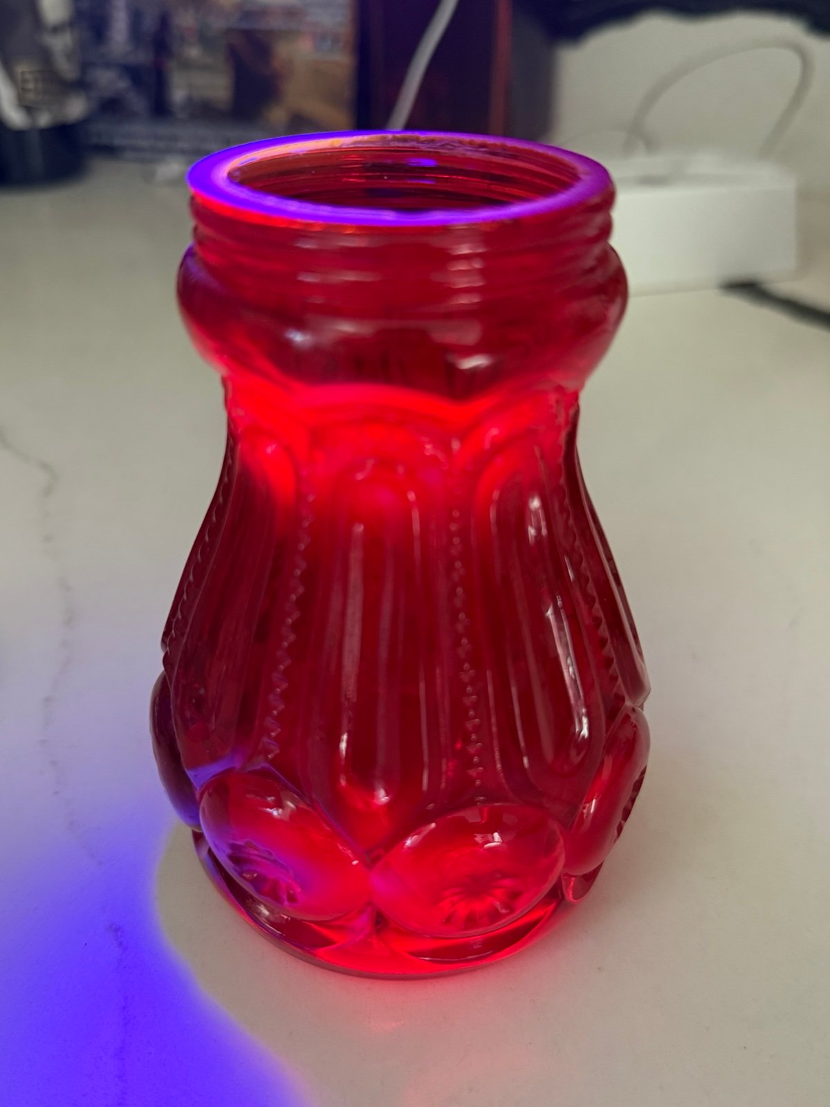 Good pre-loved condition. Some chipping in the glass as pictured by the top lid area. Lid is in good condition overall. There is a tiny bit of rusting on the inside of the lid. Glows with a black light.