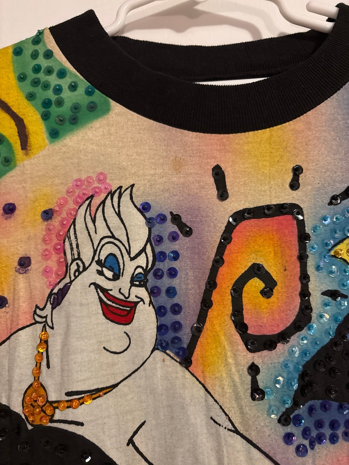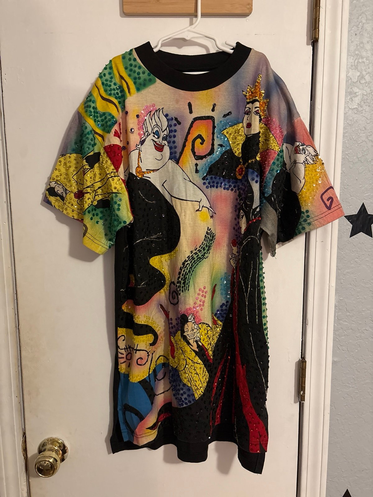 Extremely beautiful and in wonderful condition with no missing gems or sequence, Disney villains, oversized T-shirt there is one small stain at the top, but it is very unnoticeable fits like a large to extra large could also be worn as a super cute dress!