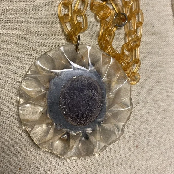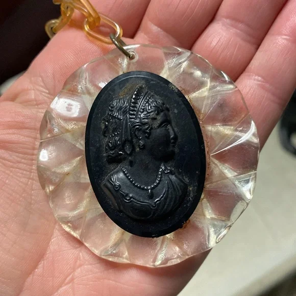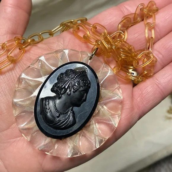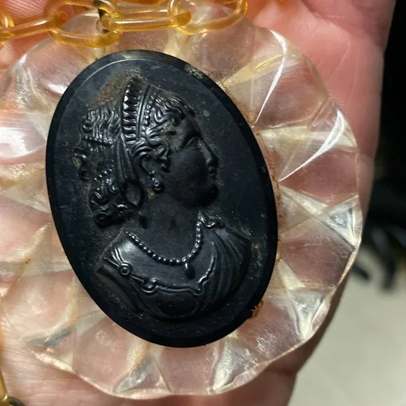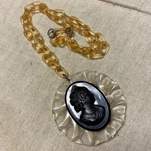 This is one of those incredible definitely vintage and likely antique early celluloid chain link necklace. The delicate early plastic oval links look original to the pendant and are intact with original hook clasp, truly a collectors piece! The massive Victorian Morning Cameo is finely done with exquisite detailing in her necklace and hair.Approximately 22 inches long and I cannot test right now but am 99% sure the links are pristal and cameo to s Bakelite!
